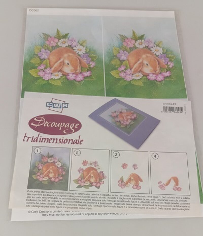 Art. 0118752 - Carta découpage coniglio. Foglio cm. 21x29,7 con 4 stampe + istruzioni. Soggetto cm. 10,5x13,5.
