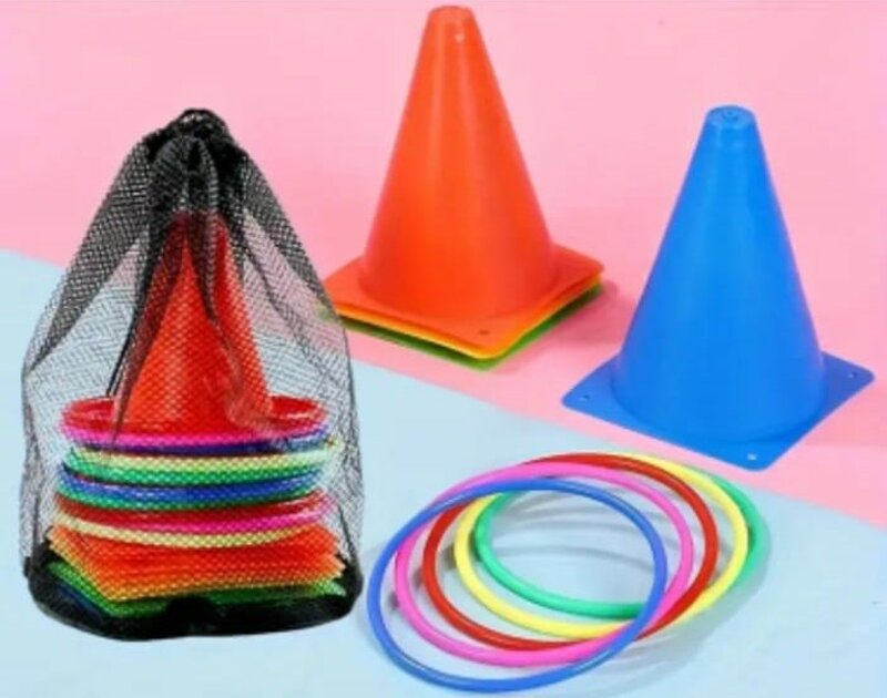 Art. C000008 - Set motricità, composto da 6 coni percorso e 10 cerchi per lancio. realizzati in meteriale plastico. Dimensioni cono cm.13x18h.,cerchio diametro cm.13,5.