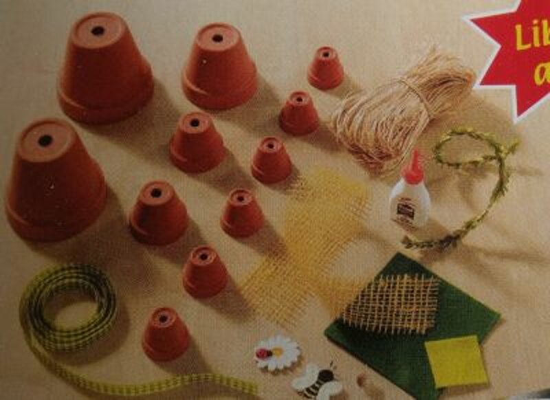 Art. 0017660 - Vasi in terracotta confezione da 22 elementi. La confezione è composta da: 3 vasi ø cm.8; 1 vaso ø cm.6; 2 vasi ø cm. 4; 6 vasi ø cm. 3; 1 .atassa di rafia naturale; 1 juta gialla cm. 5x37; 1 nastrino a quadri cm. 1x120; 1 fogliolina animata da cm.30; 2 pannolenci; 1 margherita con coccinella; 1 colla.