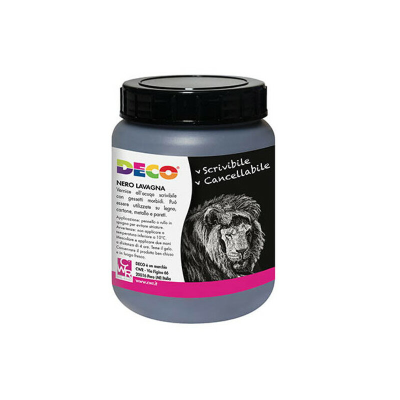 Art. 0015109 - Vernice effetto lavagna. Vernice all’acqua scrivibile con gesso. Può essere utilizzata su legno, cartone e metallo. Applicazione: rullo e pennello preferibilmente in spugna per evitare striature. Mescolare e applicare due mani a distanza di 4 ore. Barattolo da 250 ml.